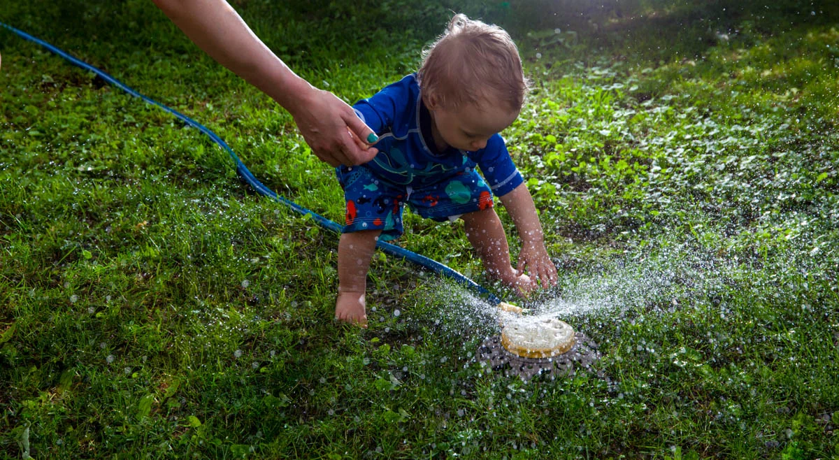 Sunny day? Check. Garden hose and sprinkler? Check. Trip to Target for rash guard and swim shorts? Check and check. Mom's outreached arm for security? Check. As a photographer I couldn't really ask for more of a serene situation to capture a timeless moment like this. I was wondering how long this little guy could handle cold water in a shady spot, and was impressed with his determination to explore and have fun. I think young children don't think about the cold and hot the same way adults do. Especially when they are doing something for the first times in their lives.